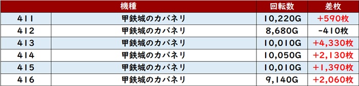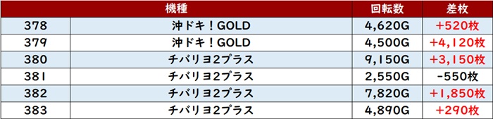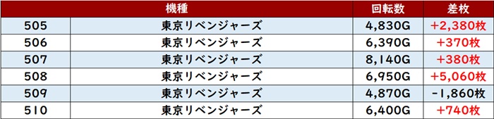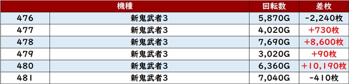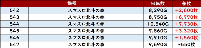 まずは「スマスロ北斗 542~547」が6台中5台が大幅プラス差枚を記録!