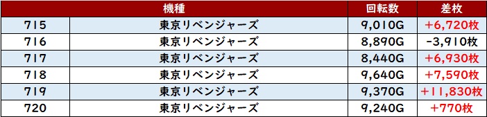 まずは「東京リベンジャーズ 715~720」が圧巻の稼働状況を誇り、熱狂の渦のど真ん中に君臨!