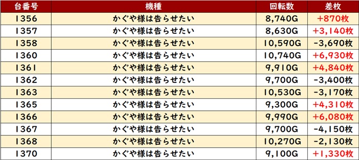 今回は「かぐや様」がなんとピックアップ台全台回転数8,600G超えと衝撃的な稼働率に!