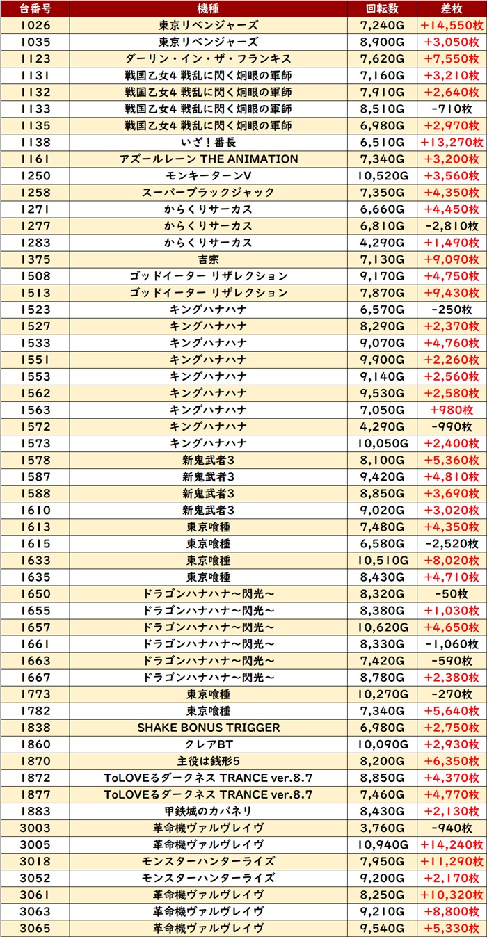 また「ヴヴヴ」「モンハンライズ」「東京リベンジャーズ」から差枚数+1万枚超えが見受けられ、多くのユーザーの度肝を抜いた。