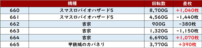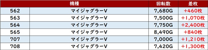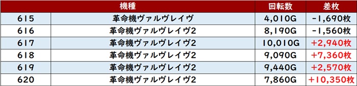 まずは「ヴヴヴ~ヴヴヴ2 615~620」の半数以上が差枚数+2,500枚超えの大幅プラス差枚を記録!