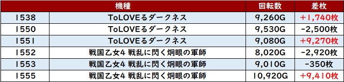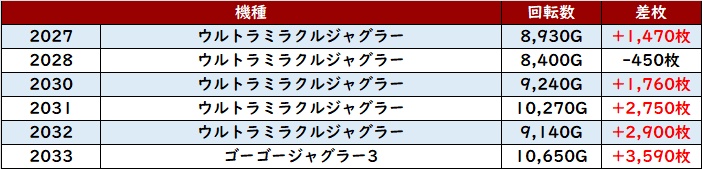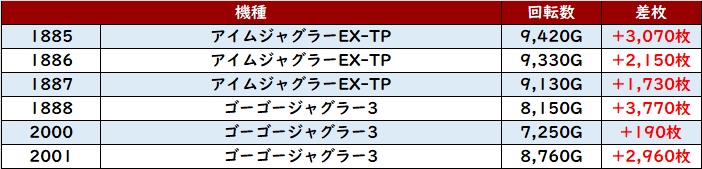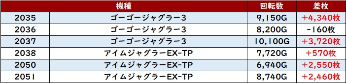 回転数9,000G超えが大半を占めており、更に差枚数+4,000枚超えというAT/ART機を凌駕するほどの出玉感も続出した!