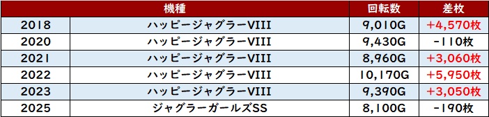 まずは「ジャグラーシリーズ」がなんと8箇所で好調さを発揮!