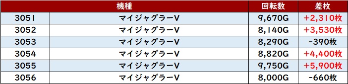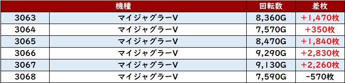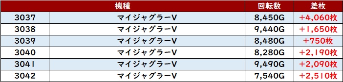 差枚数+9,240枚と大台まであと一歩に迫る台も現れたうえ、殆どが回転数9,100G超えとぶん回されており、ユーザー達の熱狂ぶりが見て取れた!