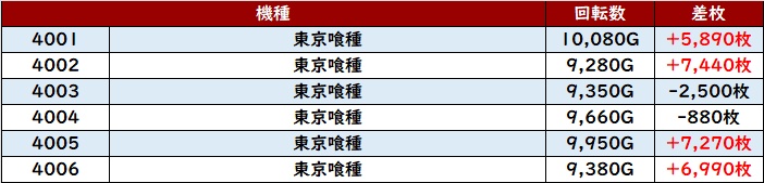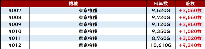 まずは「東京喰種 4001~4006、4007~4012」が計12台中9台が差枚数+3,000枚超えと圧巻の結果に!