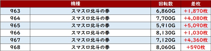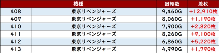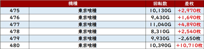 更に「東京喰種 475~480」6台中5台がプラス差枚と大熱狂!