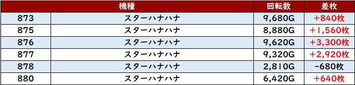 また「スタハナ 873~880」の半数が回転数9,300G超えの高稼働に!