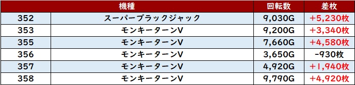 まずは「スーパーブラックジャック~モンキー5 352~358」半数が回転数9,000G超えの高稼働を記録!