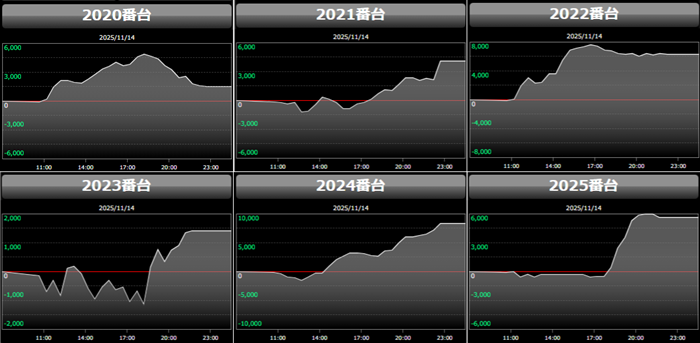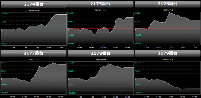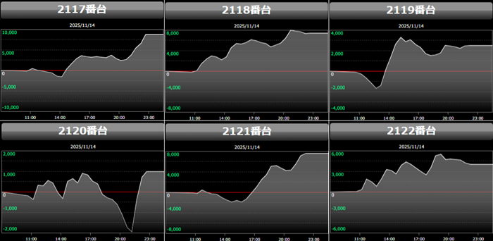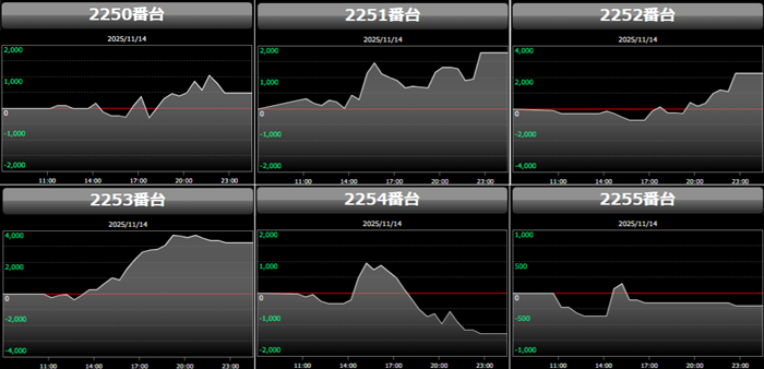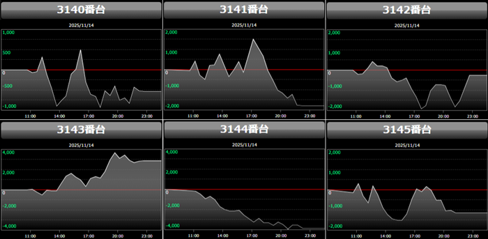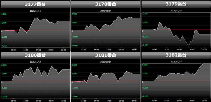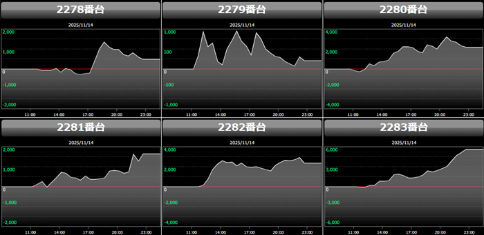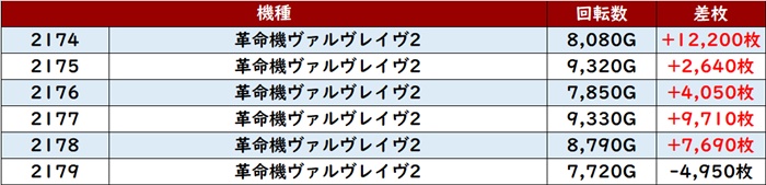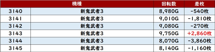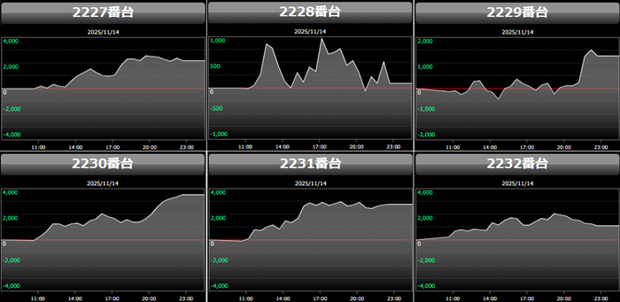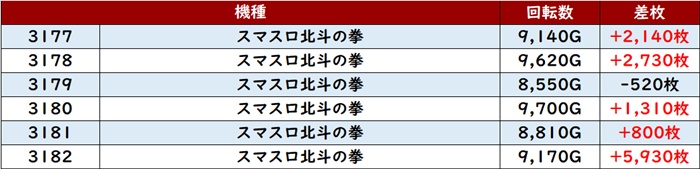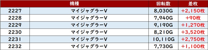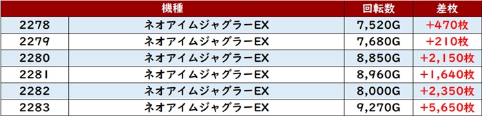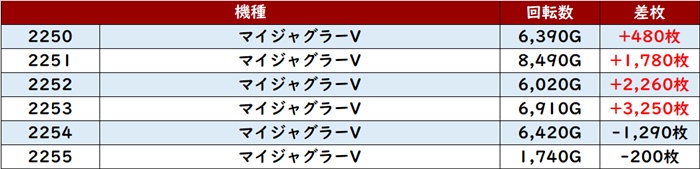 高い稼働がポテンシャルを引き出し、差枚数+12,200枚を筆頭にどの台も目を見張る出玉感を叩き出した。