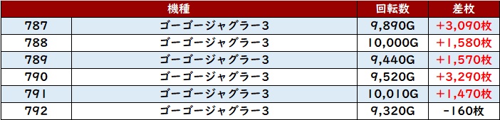 続いて「ゴージャグ3 787~792」が6台中5台が大幅プラス差枚と絶好調!