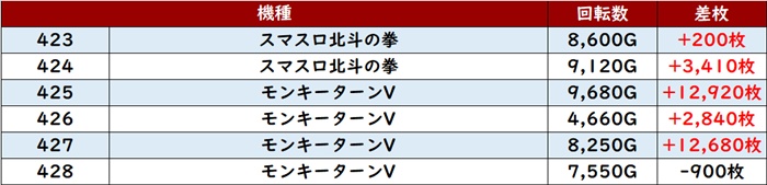 まずは「スマスロ北斗~モンキー5 423~428」から機種を跨いで大きな盛り上がりに!