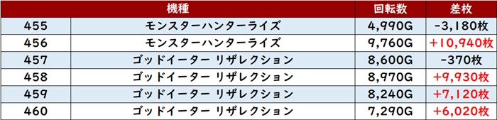 今回は「スマスロ北斗~モンキー5」「モンハンライズ~スマスロゴッドイーター」など状況が良さそうな箇所を確認!