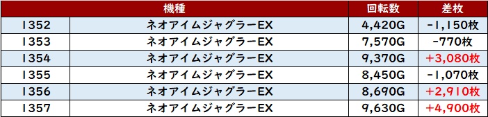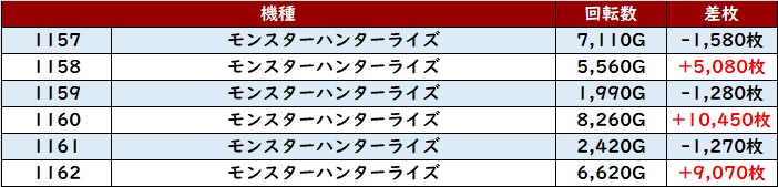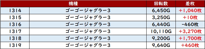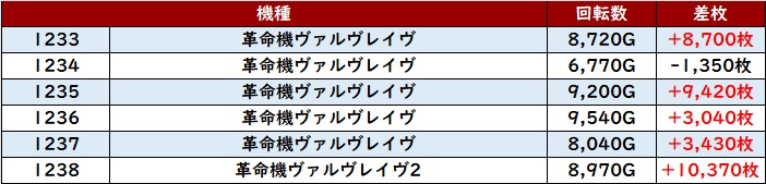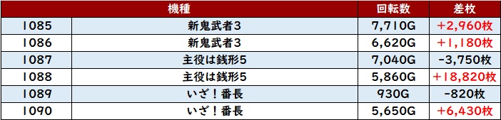 差枚数+10,540枚を中心とし、6台中5台が差枚数+2,700枚超えの素晴らしい出玉感に結び付けた。