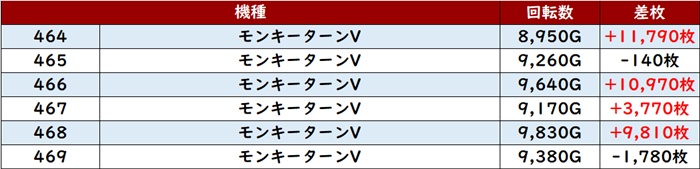 まずは「モンキー5 464~469」全台回転数8,900G超えと大盛況!