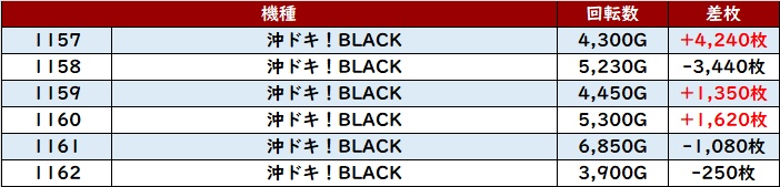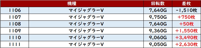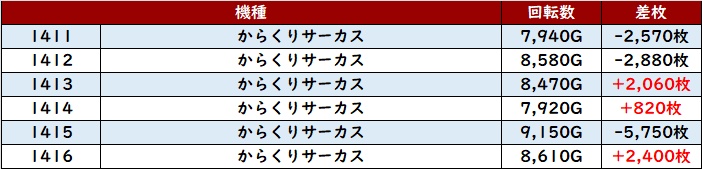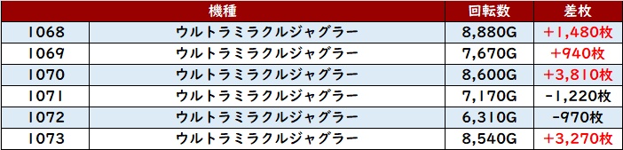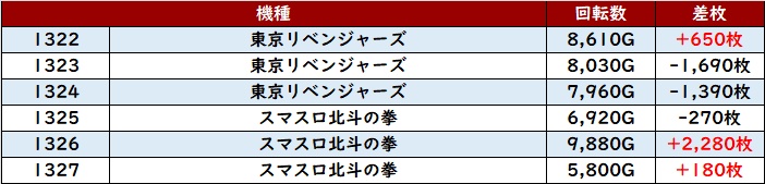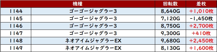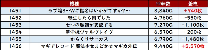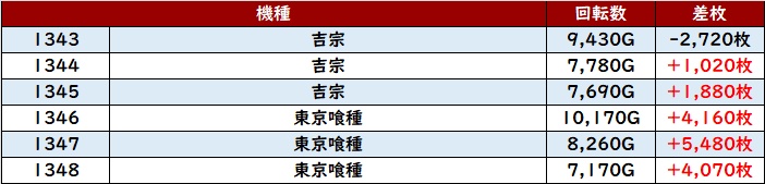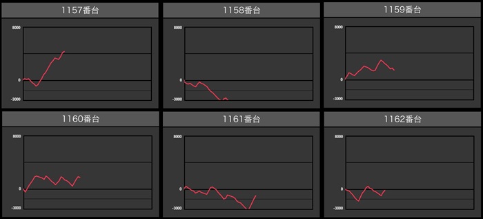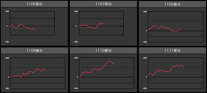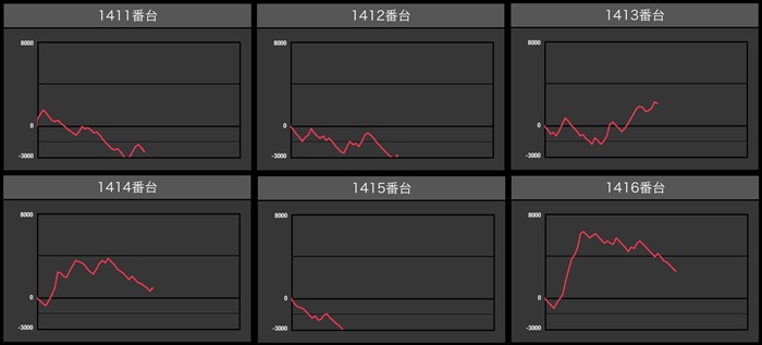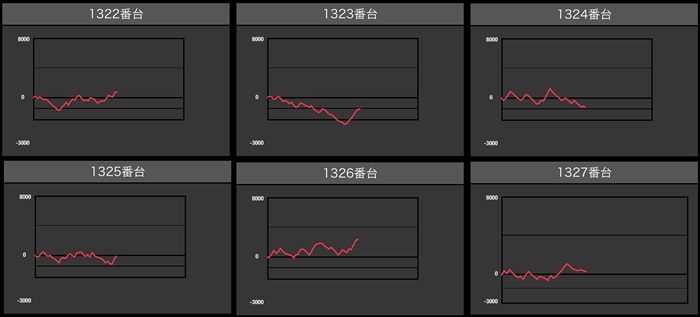 その他箇所にもしっかりとした稼働がつくも、残念ながら展開に恵まれない台が多く、物足りない結果となってしまった。