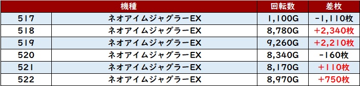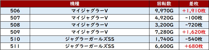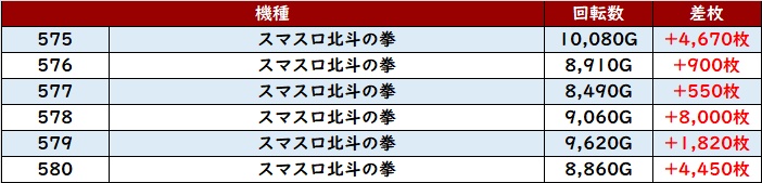 まずは「スマスロ北斗 575~580」全台回転数8,400G超え且つプラス差枚と大活躍!