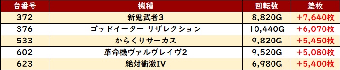 なんと差枚数+1.1万枚超えの台が2台と驚愕の結果となり、誰もが状況の良さを認識していたに違いない!