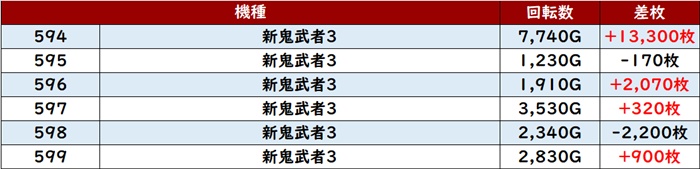 続いて「新鬼武者3 594~599」から差枚数+13,300枚と誰もが羨む出玉感を叩き出す台が現れ、注目の的に!