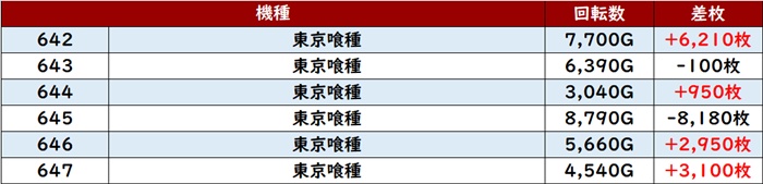 朝イチは「東京喰種」が満台、オススメ機種の「ヴヴヴ」「ヴヴヴ2」や「アイムEX-TP」「マイジャグ5」が高稼働となった。