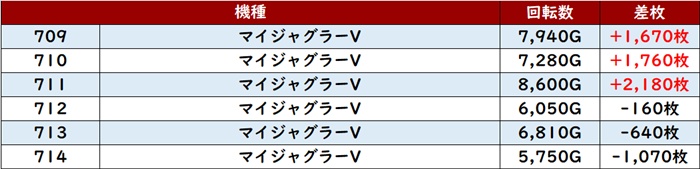 まずは「ヴヴヴ 603~608」から驚愕の差枚数+9,700枚超えを記録する台を2台目撃!