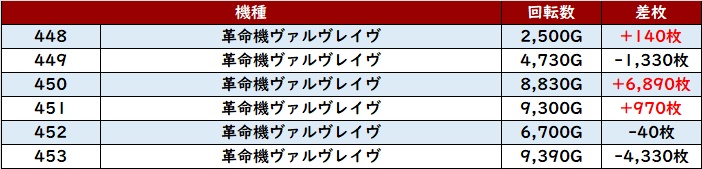 また「ヴヴヴ 448~453」も半数が回転数8,800G超えと圧巻の稼働状況を記録し、盛り上がりを後押し!