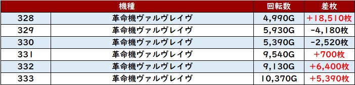 まずは「ヴヴヴ 328~333」半数が差枚数+5,300枚超えと盛り上がりを大きく後押し!