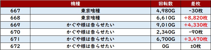 回転数9,090G且つ差枚数+8,070枚と強烈な数値を記録する台もあり、出玉感の底上げに大きく貢献していた。