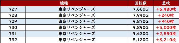 また「東京リベンジャーズ 727~732」全台プラス差枚と素晴らしい結果に!