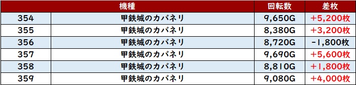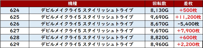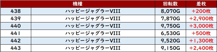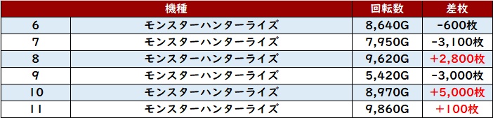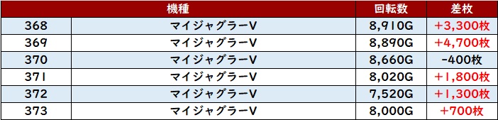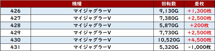 その稼働も相まって6台中5台が大幅プラス差枚且つ差枚数+11,900枚と大台を突破する台まで見られ、凄まじい熱量を感じられた。