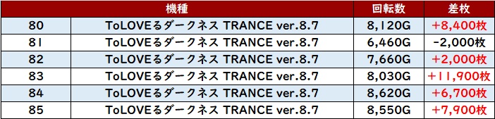 更に「ToLOVEるトランス 80~85」の半数以上が回転数8,000G超えの高稼働を記録!