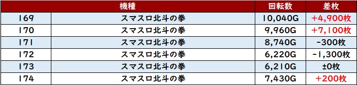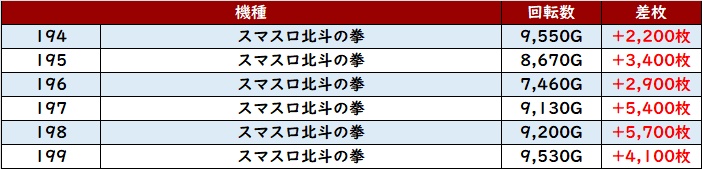 特に「スマスロ北斗 194~199」は全台差枚数+2,200枚以上の出玉感となっており、打ち込んでいたユーザーの満足に直結させていた!