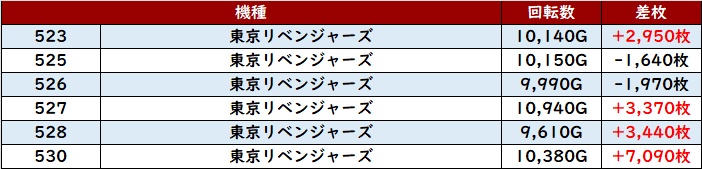 続いて「東京リベンジャーズ 523~530」の大半が差枚数+2,900枚超えと絶好調!