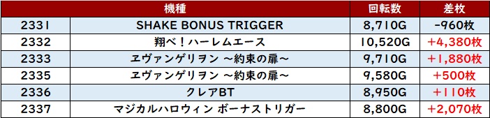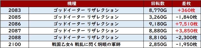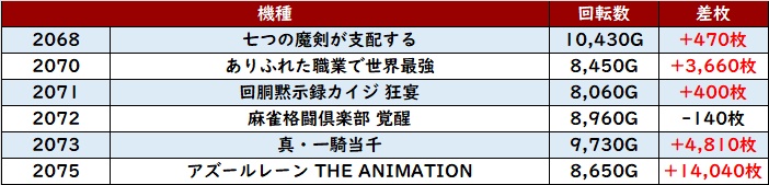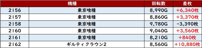 まずは「東京喰種~ギルクラ2 2156~2162」が、大半が回転数8,500G超え且つ差枚数+3,300枚超えと文句なしの結果に!