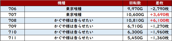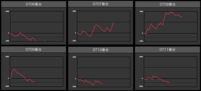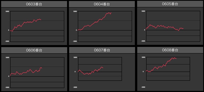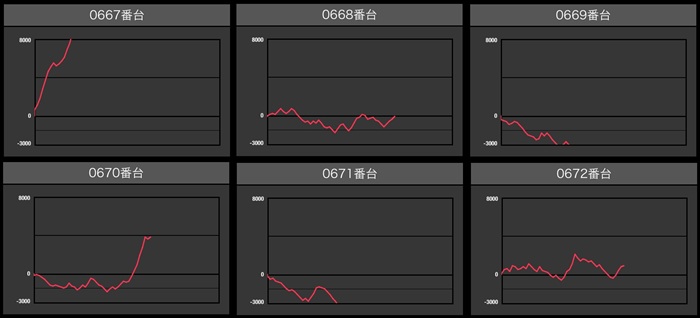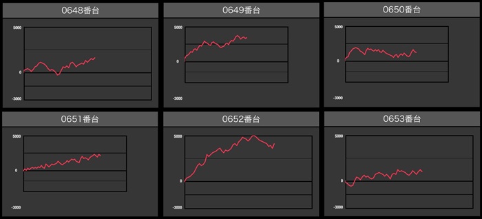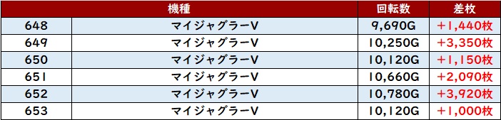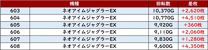 まずは「ネオアイム 603~608」「マイジャグ5 648~653」がなんと計12台全台プラス差枚と快挙を達成!