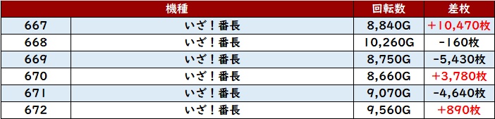 続いて「いざ番 667~672」全台回転数8,600G超えと高稼働に!