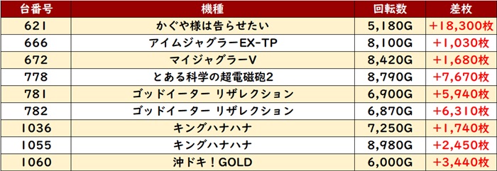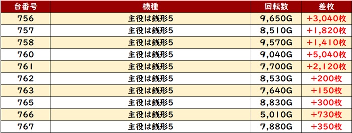 今回は「銭形5」が全台プラス差枚と圧巻の光景に!