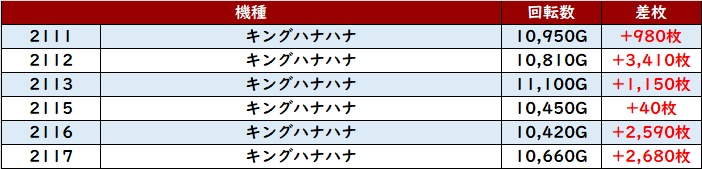まずは「キンハナ 2111~2117」が全台プラス差枚と素晴らしい出玉感に!