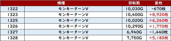 続いて「モンキー5 1322~1328」も半数が差枚数+5,100枚超えと絶好調!