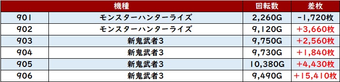 まずは「モンハンライズ~新鬼武者3 901~906」の殆どが回転数9,100G超えと終日高稼働をキープ!
