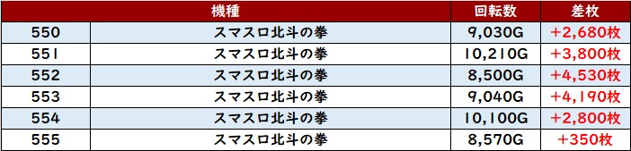 続いて「スマスロ北斗 550~555」も全台プラス差枚に!