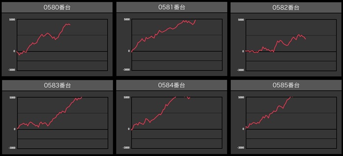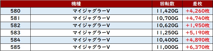 まずは「マイジャグ5 580~585」が全台回転数1万G超え&大幅プラス差枚と快挙を達成!