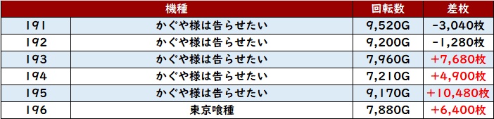 【11月24日 ニューアサヒ岡谷天竜店】スロパチ来店取材!かぐや様~東京喰種を筆頭に全ピックアップが圧倒的な数値に!機種を跨いで活躍する傾向が顕著となった!