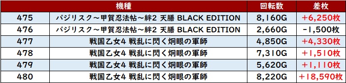 続いて「バジ絆2天膳~乙女4 475~480」機種を跨いで凄まじい結果に!
