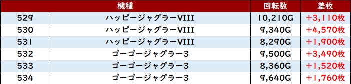 また「ハッピー3~ゴージャグ3 529~534」も機種跨ぎで絶好調!