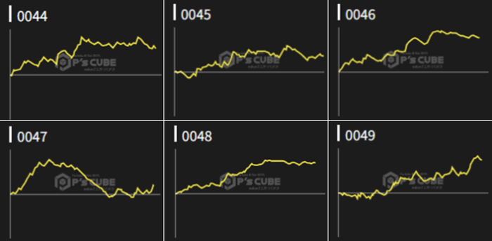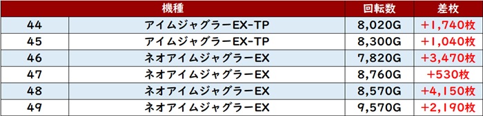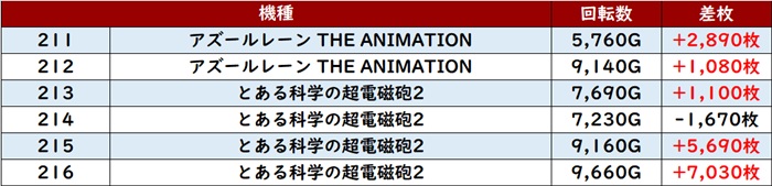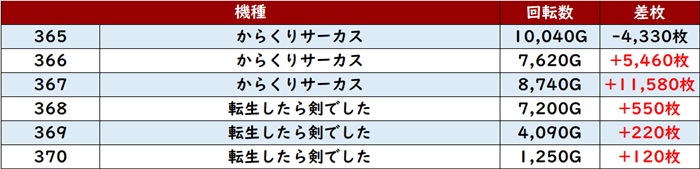 惜しくもマイナス差枚になってしまった台も含め、殆どが回転数8,800G超えとぶん回っていた!