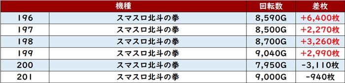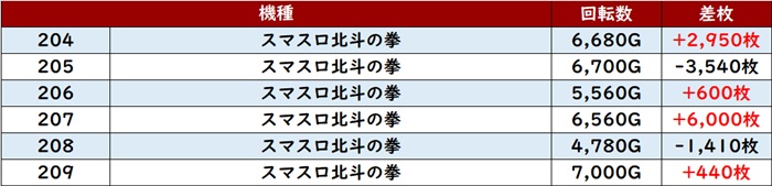 続いて「スマスロ北斗 196~201、204~209」2箇所で状況の良さをアピール!