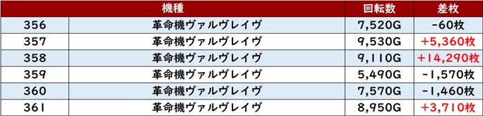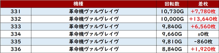 まずは「ヴヴヴ 331~336、356~361」から差枚数+1.3万枚超えとインパクトのある出玉感を複数目撃!