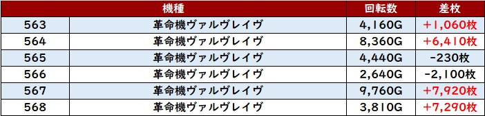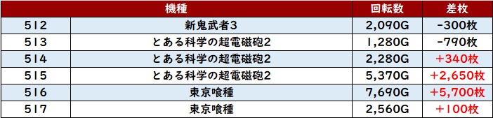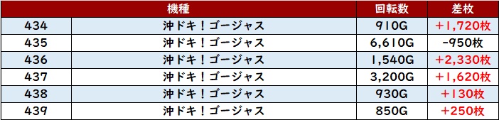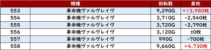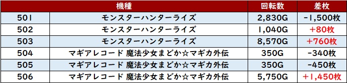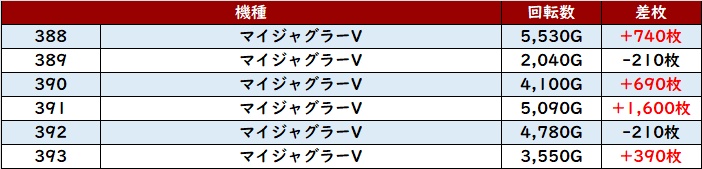 状況の良さ故か6台中4台がプラス差枚となり、中には差枚数+5,700枚と素晴らしい出玉感を記録する台も現れるなど、店内の盛り上がりに貢献した。
