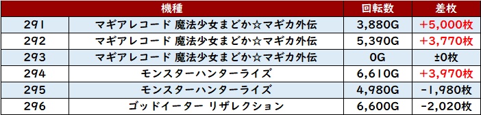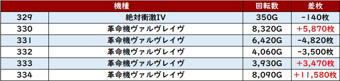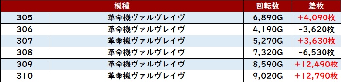 まずは「ヴヴヴ 305~310」が大半が差枚数+3,600枚超えと突出した出玉感を記録!