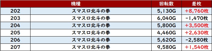 まずは「スマスロ北斗 194~199、202~207」が2箇所にわたって大賑わい!